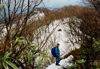 前日に、あるいは先人が辿ったのか、トレースがあり、登山道を斜めに覆っている雪は、歩くのに丁度良いくらいの堅さだが、やはり沢筋に差し掛かると、雪面が急になるのと、底が抜けないかと緊張する。