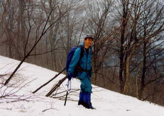 この程度の雪の状態では、必要がなかったかもしれないが、家内に訓練の為とアイゼンを装着させた。暫くすると、雨具とトレッキングシューズを履いた中年の女性二人が下山してくるのと出会ったが、「何処が頂上か分からなかったし、視界が悪いので止めた。」との事だった。