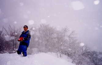 4時間半も掛かって着いた頂上は、風当たりのせいか祠周辺は積雪が少ない。そして、風雪は、私にほんの一時の休息の間も、与えてくれないほど真ともに襲い、楽しみに担ぎ上げて来た食料をリックから出す事さえ許してくれなかった。