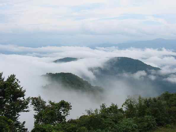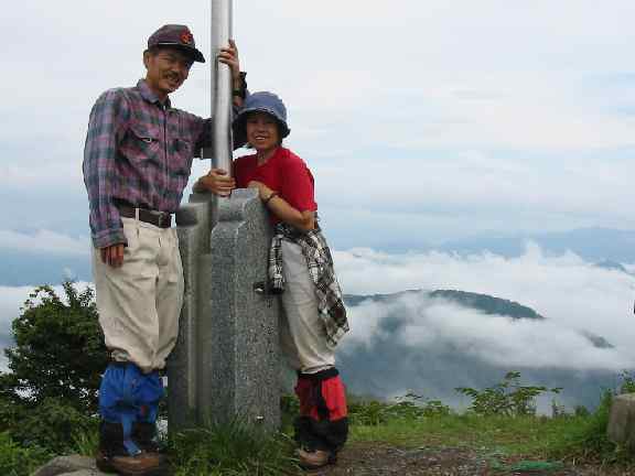 ビールもラーメンもない今日の頂上は、チョッピリ寂しいが、我々より低い所にある雲海は、砺波の散居村も富山湾も隠してしまっていたが、振替休日であっても誰一人いない山頂で、「雲上の人」のなったのがステキだった。反対方向の五箇山の山々は、その頂きだけを、雲上にぽっかりと出していて、おとぎの国にでもいるかのような感じにさせていた。午前中の雨も我々は、雨具を纏わず、リックカバーも使う事無く、ラッキーな一時を過ごした間あった。