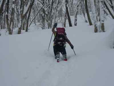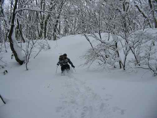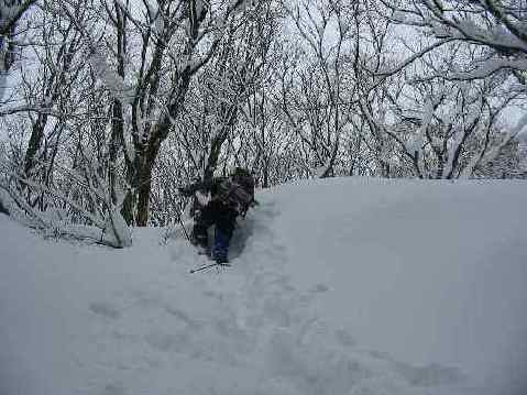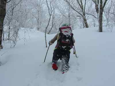 “ ここから稜線までは、すぐだよ!” と促し、左の夏道と分かれ、ブナの林を直登である。急斜面で踏み誤ると、胸までの雪に、足が小枝に絡まり身動きが出来なくなってしまうから厄介である。