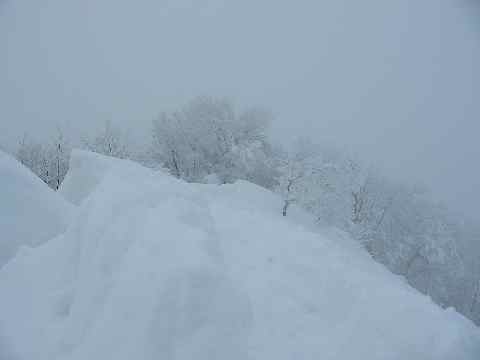 稜線に出たのが、歩き始めて3時間経った正午である。未だ日の短いこの時期のこの状態では、“ 頂上まで無理かな!” と頭を過ぎるが、“ 下りは早いからまだまだ先に行こう!” となる。展望は良くないが、ブナの尾根を歩くのは好きである。小さな起伏を何度となく越えた40分程経過した所で、何となく振り向くと後続者が「ヤーッ」と声を掛けてくれた。吉尾氏である。彼とは、雪の牛岳で過去に、二回お会いした事があり、いずれも私が先陣である。