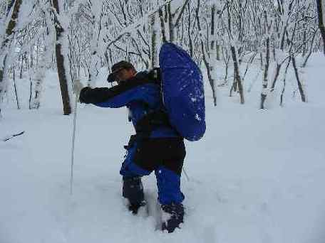 しかし、シュラフ、シュラフカバー、マットなどを省いたが、何時もの日帰りの荷よりも重たくした分だけ、足の進み方が遅かったようである。トレースを期待し、頂上までは行けなくとも、稜線まで行けないかと思っていたが、読みが浅かった上に、遅い出発が祟り、六合目で設営訓練となる。