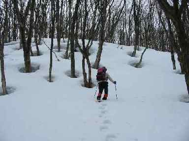 杉林から脱し、斜面の上を眺めると、一本一本ブナの周りが規則正しく、樹木の春の鼓動であろうか、ま~るく抉られている様が私は大好きなのである。