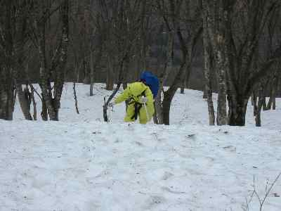 “ もう一週間もすると、この雪も溶けちゃうね!” と、山にも春がそこまで来ているようである。ぐるっと回っている林道をそのまま行くのもつまらないし、二度目の登山道と交差する所から林道を捨てた。
