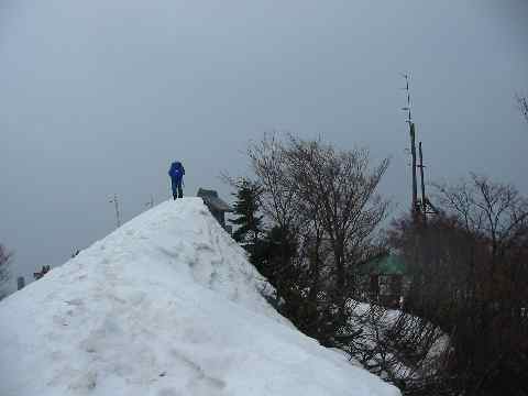 「山ノ神」は、“ ここでいいから、私にだけ頂上へ行け!”と言う。この雨の中、その間にビールでも飲もうというのか? “もう少しだから”と、半ば強要して頂上に導くが、写真一枚とってすぐUターンする。