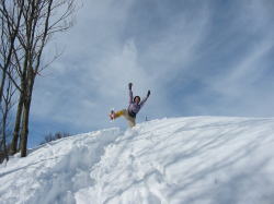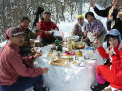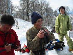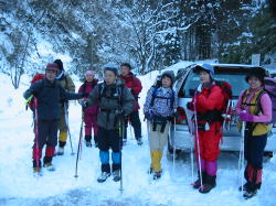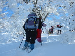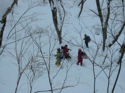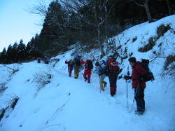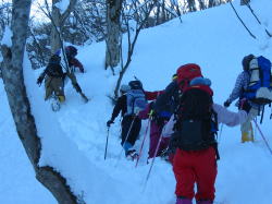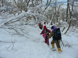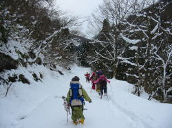 | 小枝が煩いが雪中を快適に下る | 「おーい、こっちを向いて!」 | 帰路は、林道歩きとなる |