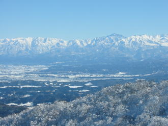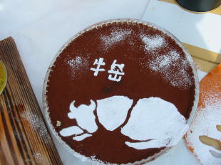 | 三角点から、絶景の北アルプスを遠望する | 「宴会」後に、堀シェフの牛岳を象ったティラミスが登場 |