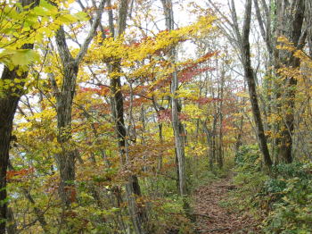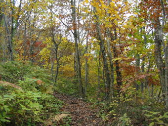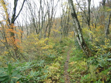 牛岳の紅葉は、まだ残っていた。五合目から六合目に掛けての中間地点が、私のお気に入りの所で、紅葉時はもちろん、新緑時や残雪時でも絵になる所であり、私は勝手に「牛岳の核心部」と名付けている。「もうチョット光が欲しい!」などと言いながら、何度も立ち止まって、シャッターを切った。黄色がいい。そして適度に赤がある。何の変哲もない「牛岳」であるが、自慢したい気になって来た。
