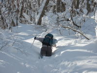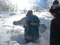 前日のトレースに、雪が覆い被さっている状態で、さほど歩きにくくなかった。それでも、林道登山口(無雪期の登山口)の積雪は、60cmくらいであった。そのトレースも五合目ヒュッテまでであった。