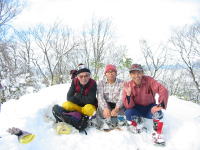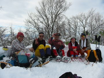 もう山頂へは当然のことながら、行けるはずもなく雪を固めて休憩する事にした。後に登って来られた小矢部の高橋夫妻も交わられ「山談義」となる。