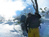 雪は締まっておらず、腰まで沈み、抜くカンジキにはブッシュが絡みつくという、とても歩きにくいものであり、六合目まで1時間20分も費やしてしまった。六合目からも直登した方がいいだろうと試みたが、なんと稜線まで1時間40分も掛かり、午後1時の到達となった。