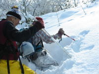 その先は、それまでに出会った井波町の長谷川氏と、同じ井波町の粟野氏と協力してラッセルに挑んだ。長谷川氏は、8年前に故高田女史と一緒に早乙女岳山行に参加された方であったとは奇遇であった。粟野氏は私の知人寺口氏をご存知の方で、大正生まれの超人であった。
