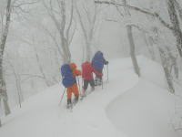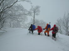 いきなり脛まで沈む雪に、4人がスノーシュー、1人がカンジキを装着し出発となる。たっぷりの雪でトレースはないが、通常のルートより西側のルート(山スキーに良く使われるルート。)の方が面白いだろうという事になる。予報に反して晴れるのではないと思わせぶりもあったが、結局は視界もなく、対岸の八乙女山も見る事も出来なかった。