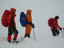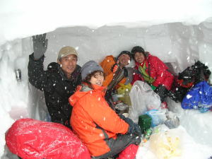 所によっては、30~50cmの積雪を観測し、真新しい雪に、我々は喜びながらの登高となる。今日は登頂後、三角点に戻り雪洞堀の練習となった。天井を平にしないと結露で悩むとか、開口部が広く雪が吹き込むなどの苦い経験をしたが、非常時にもぐり込む訓練となった事は間違いないようである。あの硬い雪を、スノーソーで切って、効率をあげたテクニックを、「ひろしスペシャル」と名付けたが、もっと時間があれば、「北ちゃん」と橋本君の手際よさを持ってすれば、ステキな居住空間となる事受け合いであろう。