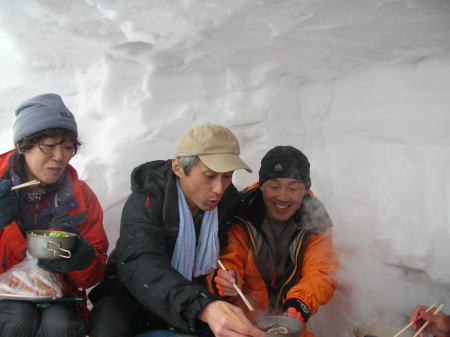 稜線は-5.8度。雪洞の中はそうでもなかったというものの、風雪が吹き込み震え上がる程の寒さであったが、その作業に1時間以上費やした事もあり、その雰囲気を充分に楽しみながら、またまたご馳走に舌鼓を打った。