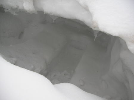 三角点に着いてびっくりした。3週間前に造った雪洞が今も残っていたのである。入口はやや下がり気味で、頭がつかえるくらいであったが、それ以外は、ほぼ現状のままで、入口に雪が覆い被さり、より雪洞らしくなっていた。