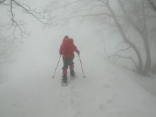何にも見えない真っ白な山の中は、もちろん誰とも会わないのであるが、今年から使い始めたスノーシューを交互に使ってみたり、勝手気ままに休息を取ったりしながら、自由奔放な山行であった。