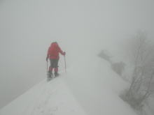 休日は、とにかく、山に行かなければ納まらない自分(達)は、やがて雨もあがると信じて、牛岳に向かった。午前10時過ぎの出発時でも、小雨がぱらつき、稜線に出てからは、小雪まで舞う状態であった。視界は悪く20~30m、新たな雪が5~15cmと、予想以上に悪い気象状況に、昨夜の中止は正解であったのだと自分に言い聞かせた。