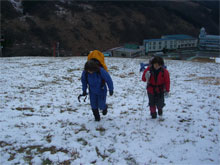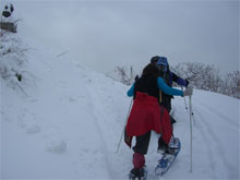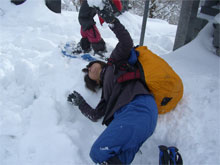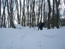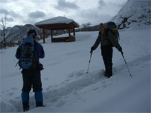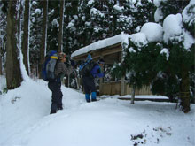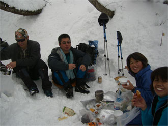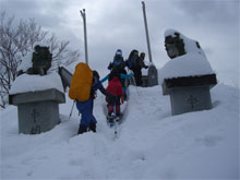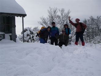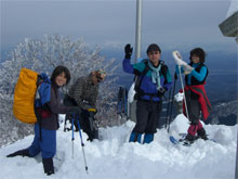 始めは雪のないゲレンデを、上部では50cmの積雪の中を、駆け上がるように歩いた。林道、そして、二本杉からの登山道と、北ちゃん・イッちゃん・まきちゃんの快足揃いの中では、終始我々夫婦は遅れがちであったが、それでも要では、ちゃんと合わせてくれる気の使いようであった。
