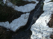 沢沿いの崩落した雪塊。 |