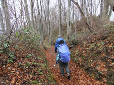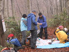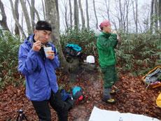 p.m.0:32 ブナ林に入ると急に風がなくなり、 お腹が空いた事もあり、食事処に決まる |