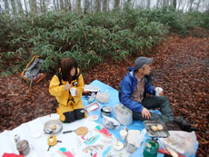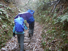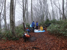 p.m.0:39 「こんなお天気では、誰も 来ないだろう。」 となり、落葉を下に、 登山道の真ん中で店を広げる事に・・・ |