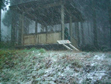 a.m.10:50 何故か駐車場には数台の 車が駐車していた。 登山者の車では ないような・・・ そして、雪になった。 |