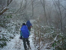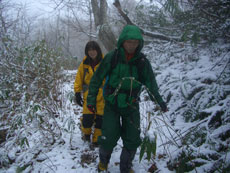 a.m.11:44 一時の降雪で、真っ白になった。 葉っぱ隊長にマキちゃんが続く。 |