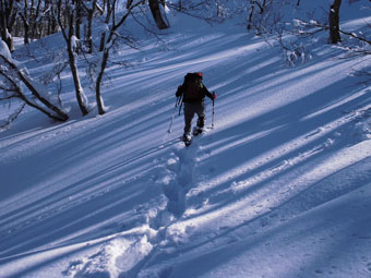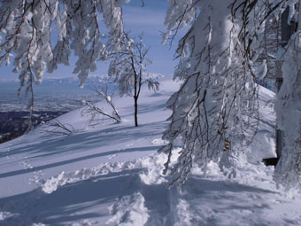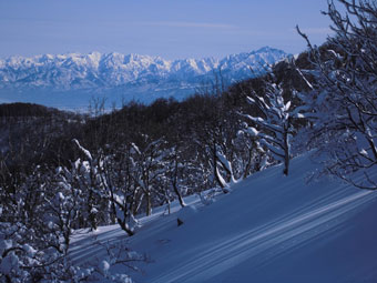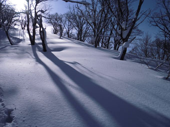 2日前まで傘マークが入っていた今日のお天気であったが、昨日の予報より、またまた上方修正されたかのようにピーカンとなった。青い空と踏まれていない白い雪、そして、木陰とのコントラストが私は好き。もちろん、久し振りに見た北アの山々の雄姿にも感激しないわけがない。