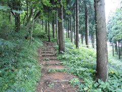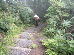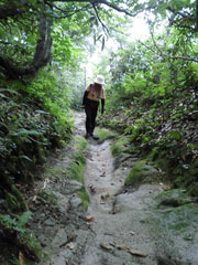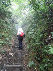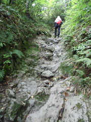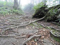 ~~ 蔓延った根っ子や、滑りそうな石の階段状の登山道になる。 ~~