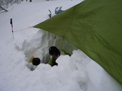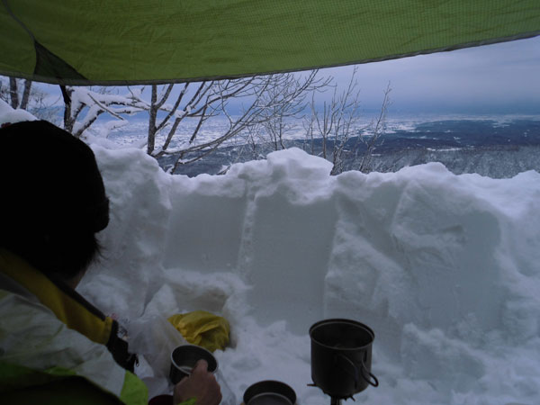 仕方なく斜面を利用して、背丈以上の穴を掘る。それでも強風は、雪煙を伴って吹き付けるので、潜る足下を気にしながらタープで覆った。それが奏功し、風を凌いで温かい物を食すれば、一気に身体中が、指先までホンワカとなる。
