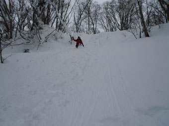 登りに苦労した急登箇所の隣の斜面を駈け降りる。