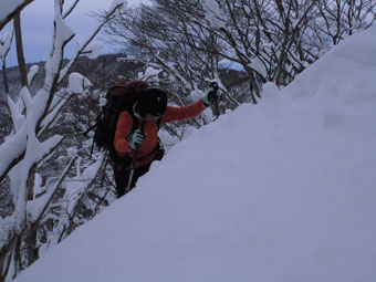 稜線に出て穏やかさが一変した。五箇山側から吹く風は冷たく、一気に体温を奪っていく。「あと二つのピークを越せば三角点だ。」 と言って励ましたが、「山ノ神」は、しゃりバテを理由に、一つのピークを残して、今にも歩くのを止めようとする。