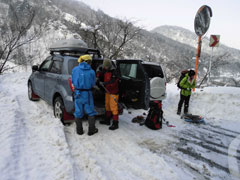 2/10 孫達を保育所に送ってから、庄川道の駅で、「橋ちゃん」 と待ち合わせた。利賀街道牛岳登山口から、ちょっと行った広い所(降雪時の雪捨て場)で、準備をしている時に、保育所から電話が掛かった。「上の孫が、高熱(39.2℃)である。」 という連絡であった。緊急連絡先というので、私のところに掛かって来たのであるが、今日は客人があったため、「今、山の中にいる。」 と言ってしまった。