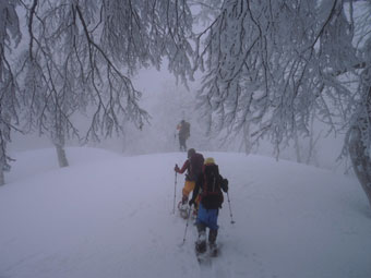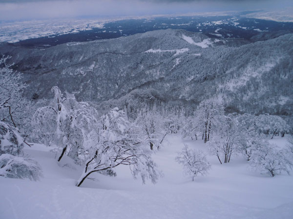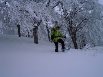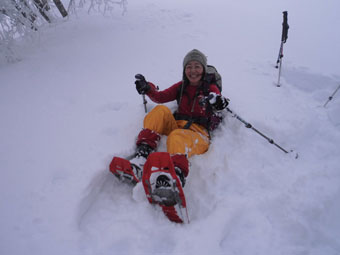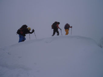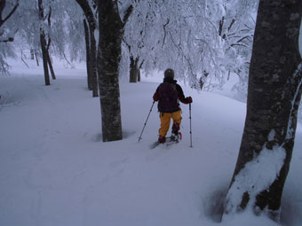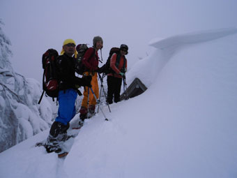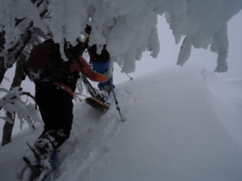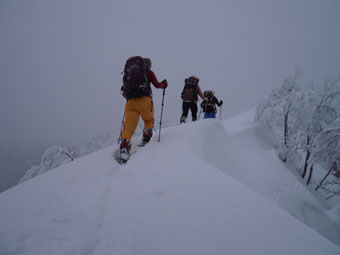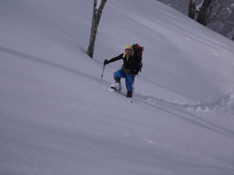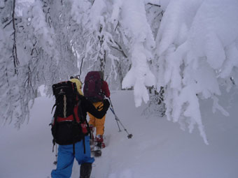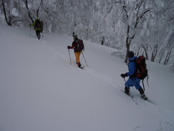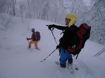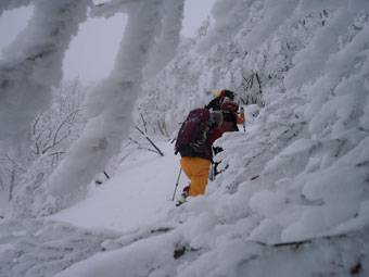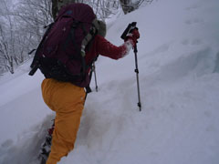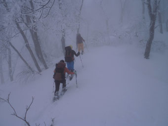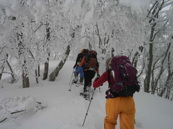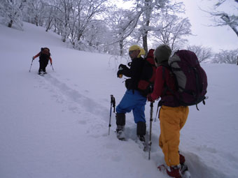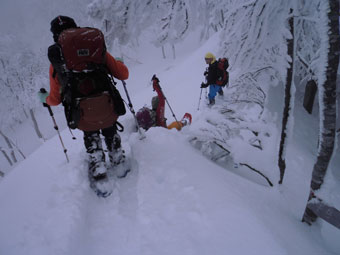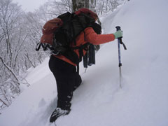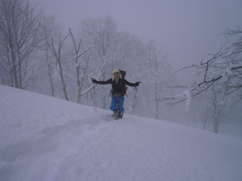 心配していた雪量も、今回の降雪・低温で、それなりの雪があった。6合目まで前日のものと思えるトレースにしたがって楽をさせてもらった。「雪に埋もれたい。」「腰までのラッセルを想定していた。」 と言っていた由起子さんには、途切れていたトレースが、ちょうど良いように思えた。