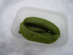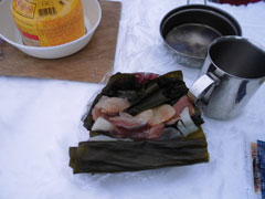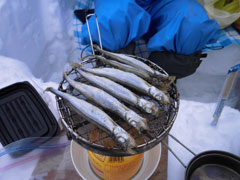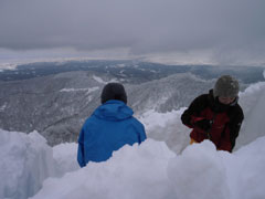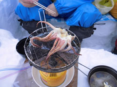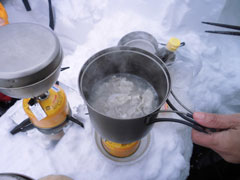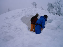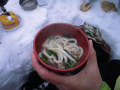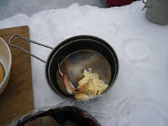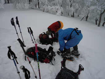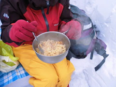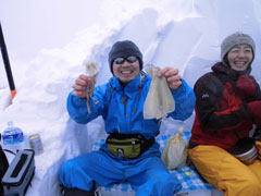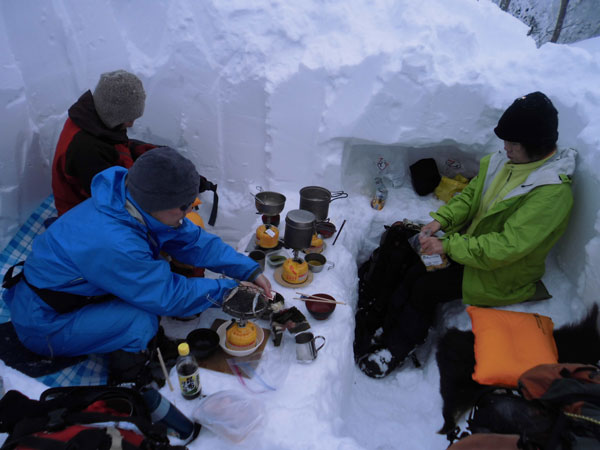 食事をするとなれば、テーブル・ベンチが必要である。背丈以上に掘り下げ、珍味に舌鼓を打たせた。次から次へと出る食材に、お腹がいっぱいでどうしようもなくなった。そして、長い間過ごすには、タープ張りを省いたため、やっぱり寒くていたたまれなくなってしまった。早々にベンチを埋め、下山開始したが、真新しい雪上の降りは楽しいものである。