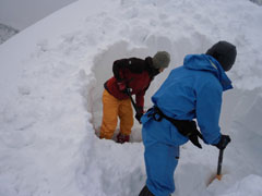 三角点でシェルター造りです。由起子さんも頑張りました。