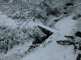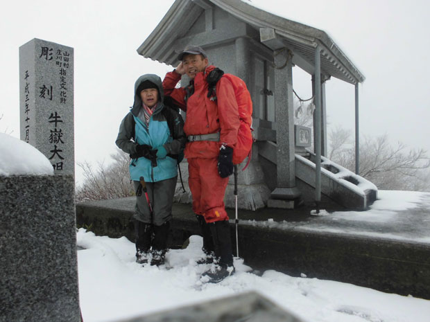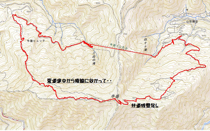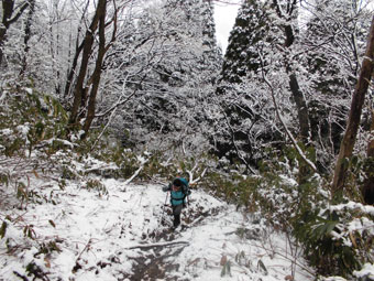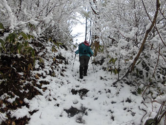 その牛岳も、4合目辺りから、新雪の上を歩かされてしまった。と言っても、夏道の上に、5~10cmの雪であったから、6合目からも夏道を選んだ。しかし、残雪の上の新雪は、登山道を覆い、トラバース気味の歩きは良いとしても、時々、小滝のような所をクリアするのでは、「こんなのに行くの?」 と「山ノ神」は言う。