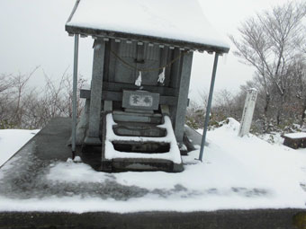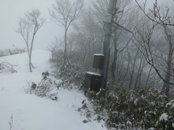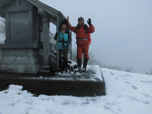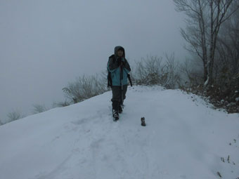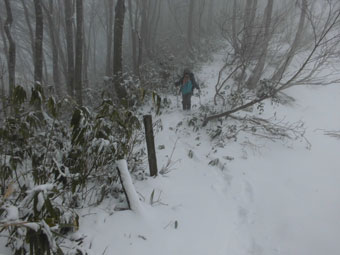 悪戦苦闘の末、稜線に辿り着けば、雪上を歩けるような快適さを想像していたが、そう甘くはなかった。それでも、ヤブを巻くように雪上を辿るような事は出来たのである。頂上に着いても、あの予報のお天気は望めなかった。それどころか、雪が降って来るではないか?