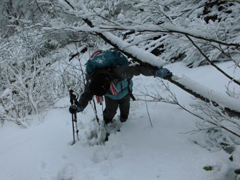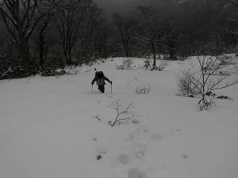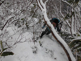 それではと、8合目手前のイヤな所に行かぬ間に、登山道を外し、ヤブを押して稜線を目指した。ヤブ嫌いの私でも、その方が安全という事は知っている。泣き泣きかもしれないが、「山ノ神」は、着いて来るしかない。標高600~700mくらいでは、雪があっても、下は滑りやすい植物で有り、目の前は、すぐにでも跳ね返る小枝の連続である。