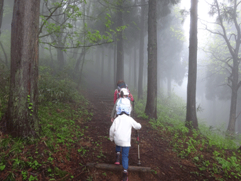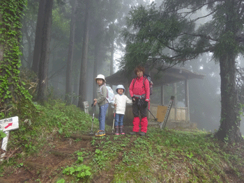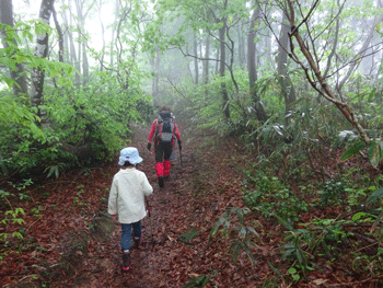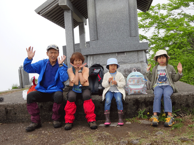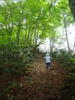 「まだか?まだか?」 と言いながら、小さな子達であるが、ガスで煙るブナ林や、少しずつであるが、陽が差す新緑に思わずキレイと言う言葉が飛び出していた。牛岳権現様のある頂上に辿り着いて、「もう、15~20分程歩くと、牛岳で一番高い所に行けるんだけど・・」 に、イヤイヤか、楽しいと思ったのか分からないが、二人の孫(ミーとエリー)は、走るように登って行った。