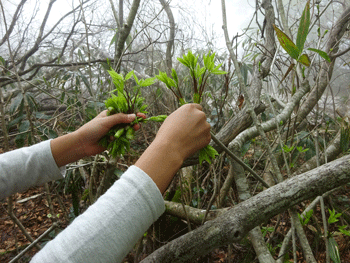 それから、欲深い私達は、ワラビとフキノトウを採りに出掛けた。ワラビはある程度の収穫はあったが、フキノトウは、まだ雪の下らしく、あまり採れなかった。それでも、こんなジジババに、よく付いて来てくれたと感動ものだったが、最後の最後に「くたびれた!」 となってしまったのである。ご褒美は、国道に出てからのコンビニアイスクリームだけであったが、コシアブラ採りや雪上歩きなど、非日常の事だけに、それなりの喜びであったらしい。朝8時過ぎに家を出て、戻って来たのが午後6時半なんだから疲れた事だろう。