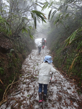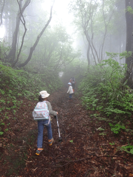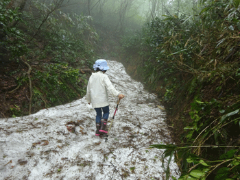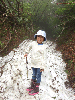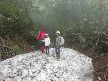 二本杉から歩き始めたのが、午前10時頃、ガス・ガスで見通しが効かなくても、「その内、晴れてくるよ!」 と言うしかなかった。案の定、グチャグチャの登山道に、残雪が現れた。それが結構あるのだから、主催者側?(笑)のこちらとて心配になってくる。しかし、時折、ズルっと来ても、その分大きくなって来ている孫達は、意外としっかりしていた。