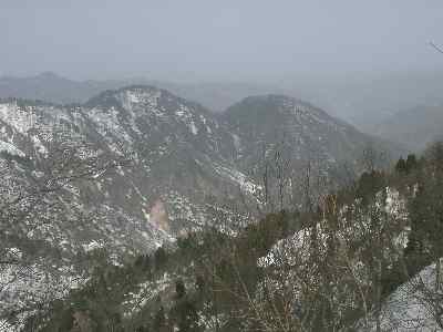 しかし、そんな所も暫くで、やがて緩やかに、そして広くなって快適な尾根歩きに変わってくる。コル付近で見た後ろのピークは、大辻山に似た山容をしていたが、次第に高度を上げると、今冬登った「肉蔵山」からの尾根と、大辻山からの尾根が合流するピークである事がわかり、肉蔵山から、この臼越山に来れないかと思っていたのだが、“これは遠いぞ!” と改めて思ってしまった。その肉蔵山のピークは、こんな表現では、顰蹙を買うかもしれないが、オッパイの形をした双耳峰で、光線の関係からか蒼く奇麗な形をしていたが、千石川源流の黒村谷も、深く切れていて、奥深い山を更に印象付けた。