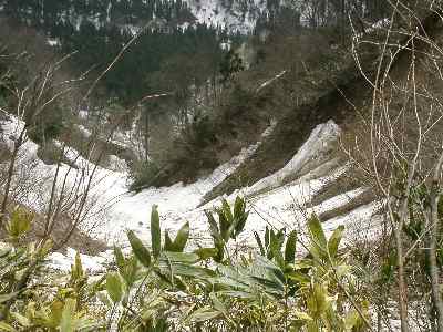 幾つもの小さな砂防ダムのある谷の雪が残る左岸を、煩い木の枝やツルを払いのけながら、高度を上げて行くと、やがて、谷が深くなり、谷を覆った雪渓の上しか行く所がなくなるが、その雪渓も雪解けと共に、中を抉られてしまい、自分の重さに耐え切れるかなどと考えなければならず、それを避けるとなると、藪の中に突入しなければならない。三脚やピッケルが絡まり余計な労力を消耗するのもその時である。