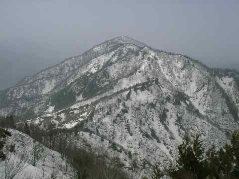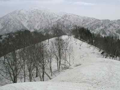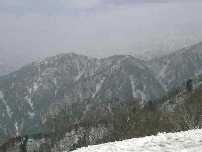 やっとの事で稜線に出た。コルから少し頂上よりに出て、快適な尾根歩きを期待していたが、もう既に雪解けが始まっており、登って来た南側は、もう雪がなく、尾根筋も溶けかかっている。雪上を歩くとなると、急斜面を左に見た北側斜面を、トラバースするようにしなければならず、それでも、雪の付いていない所を避けると、その分だけ、急斜面を登り返さなければならず、ピッケルを握る手にも緊張が走る。