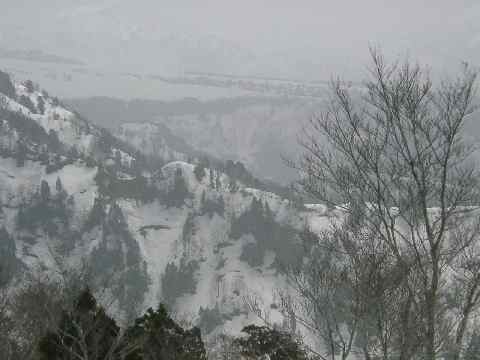 ファージーな谷だが、北に進むと雪の下から流れが聞こえ、谷も次第に狭くなってくる。今日は、朝方から気温が高く、常願寺川で17℃、立山公園線で22℃と温度表示板を見て来たように、フェーン現象のためだろうが、雪の上を歩いていても熱風となって異様な感じであった。