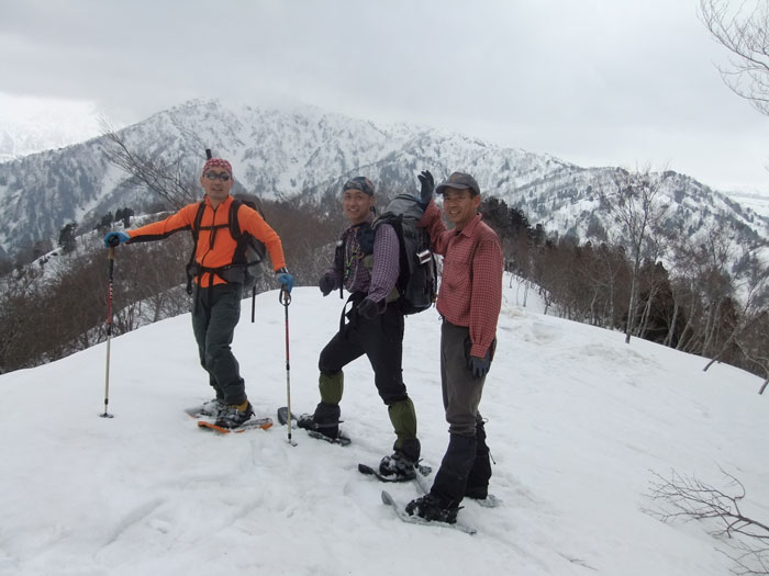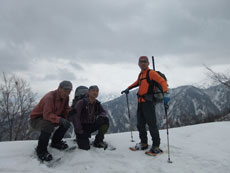 | a.m.9:36 「山頂に着いたぞ!」 | a.m.9:42 臼越山々頂にて記念写真。 | a.m.9:47 山頂に長居せず、すぐに出発! |
