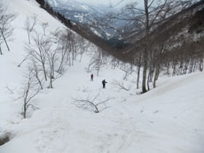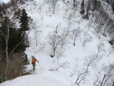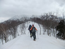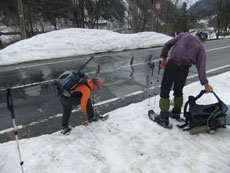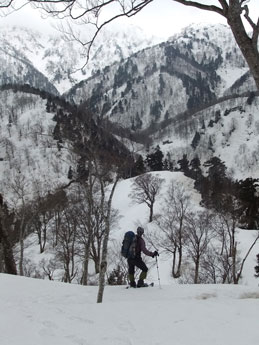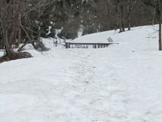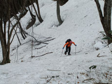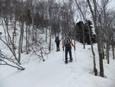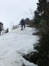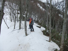| a.m.7:50 慎重に・・・ | a.m.7:51 イヤな雪の着き方の林道を突破 | a.m.8:08 斜面を登れば林道に・・ |